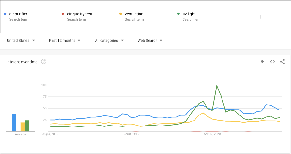 Now, as we begin to reopen the economy, think about returning to work and school, and learn more about how the virus spreads through the air, we’re seeing search trends shift again to air purifiers and filtration solutions.
